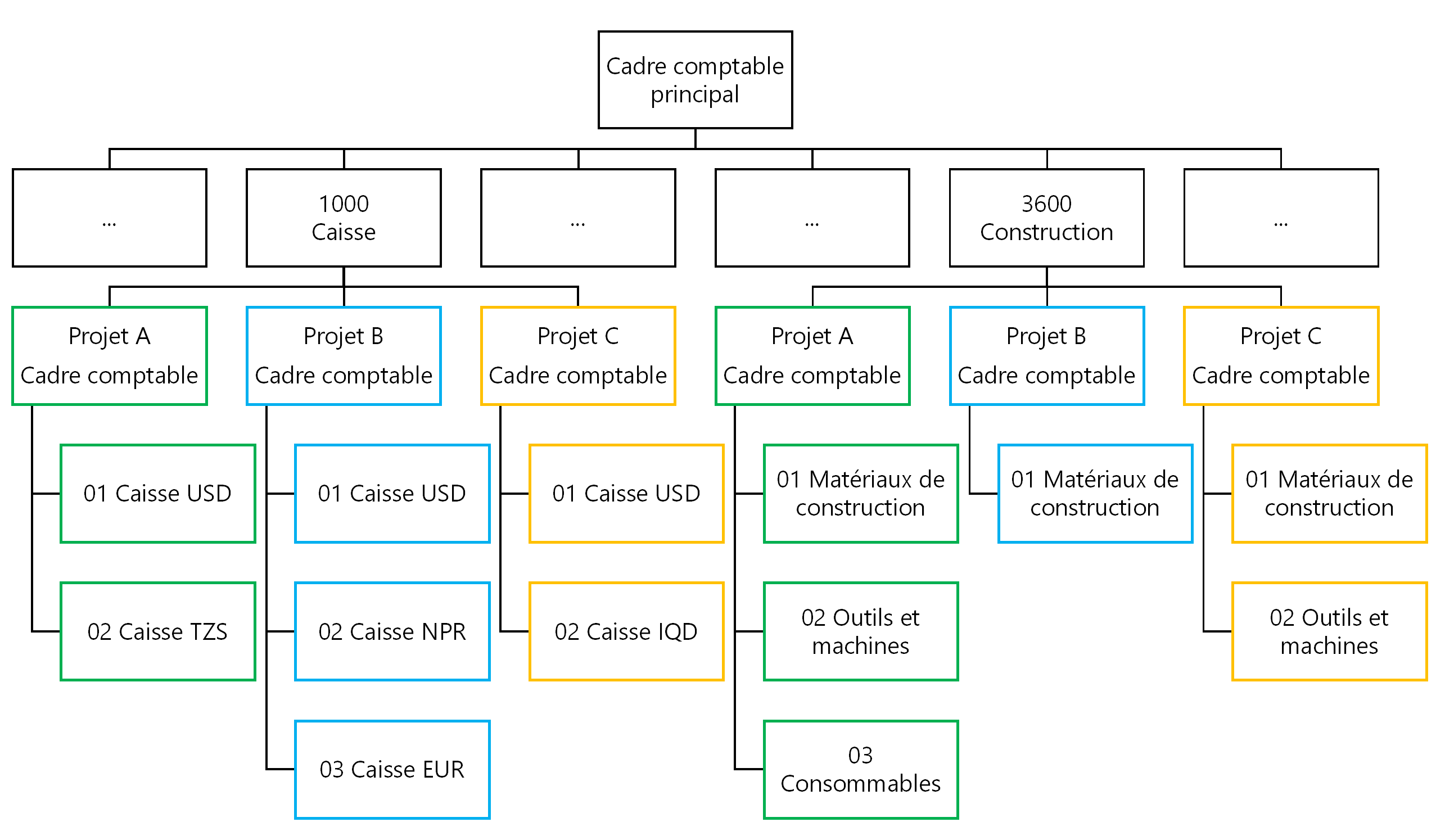 Le cadre comptable principal WINPACCS de votre organisation donne une structure uniforme pour tous les projets et permet de définir des réglages de compte à l'échelle de l'organisation pour tous les projets. Toutefois, vous ne pouvez pas comptabiliser directement sur les comptes principaux. Le cadre comptable spécifique au projet garantit que :